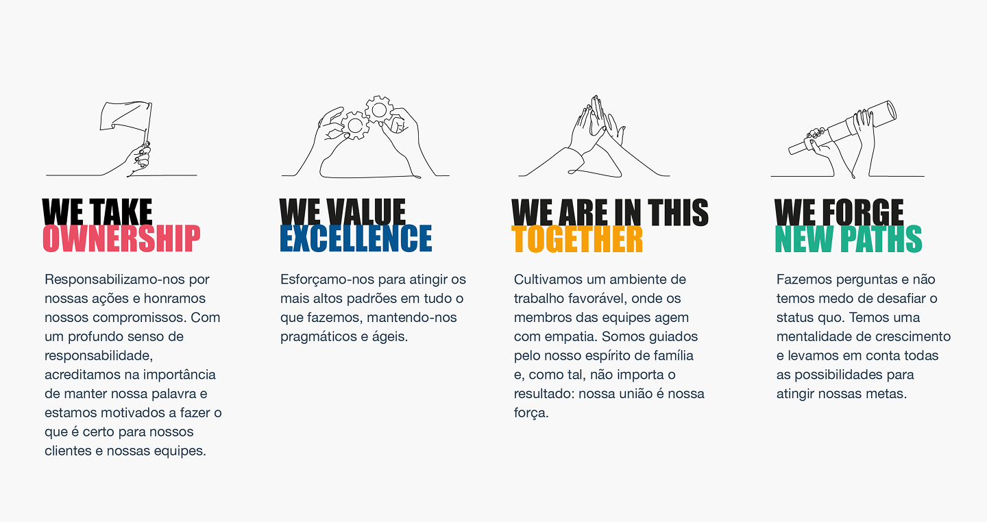 Nossa visão se traduz em quatro valores. Esses são os princípios que orientam os comportamentos da nossa empresa